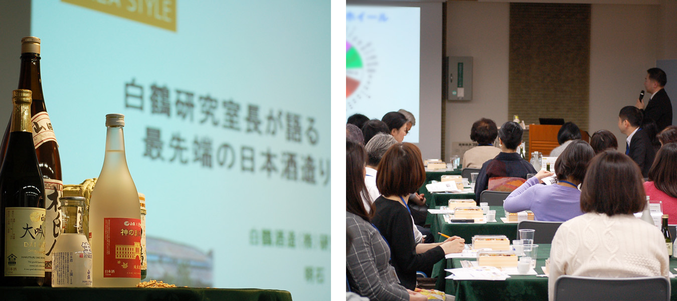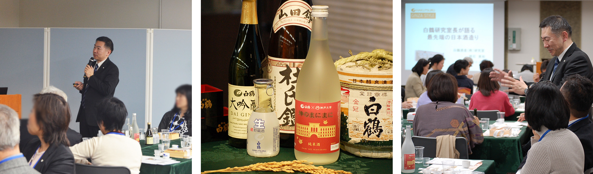 白鶴の研究室長によるセミナーを開催。最先端の醸造研究や技術開発について、わかりやすく丁寧に解説しました。研究室の様子や苦労話など、なかなか聞けない裏話もたっぷり披露。普段知ることの出来ない日本酒の奥深い世界を学んでいただけるセミナーとなりました。
