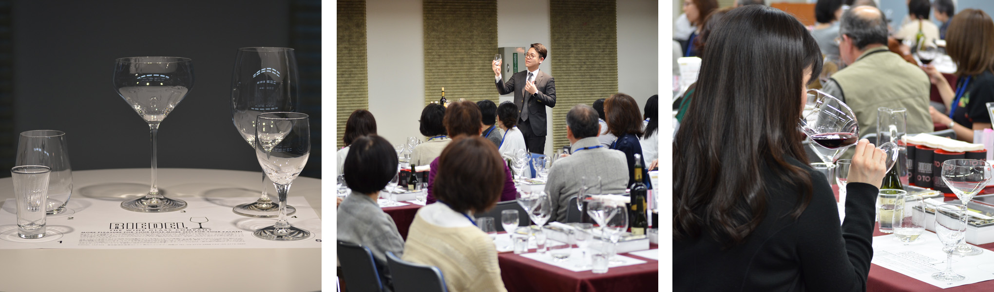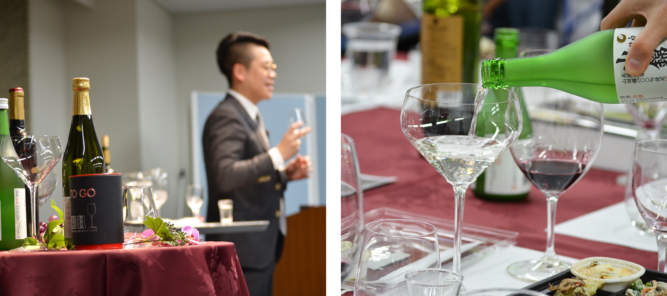 RSN Japan 株式会社のワイングラス・エデュケイター竹中氏のお話を聞きながら、リーデル社が大吟醸専用に開発したグラス「リーデル・オー大吟醸」をはじめ、その他のグラス・酒器を使用して日本酒やワインの香りや味の違いをお楽しみいただきました。また、純米酒に特化し開発された『純米グラス』も使用し、純米酒のふくよかな米のうまみを存分に味わっていただきました。