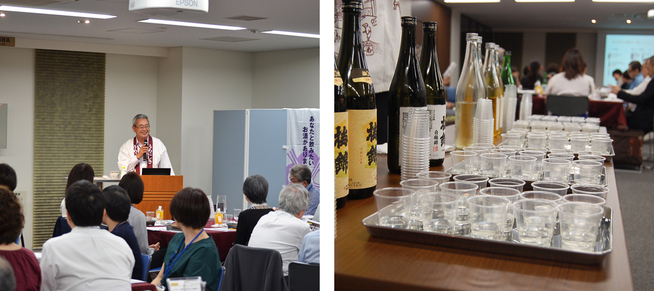 愛媛県蔵元「梅錦山川」から講師を招き、蔵元の話を聞きながら推奨の日本酒を存分に味わっていただきました。参加者には地元食材を使ったお弁当やおつまみもお楽しみいただき、大変贅沢な内容となりました。