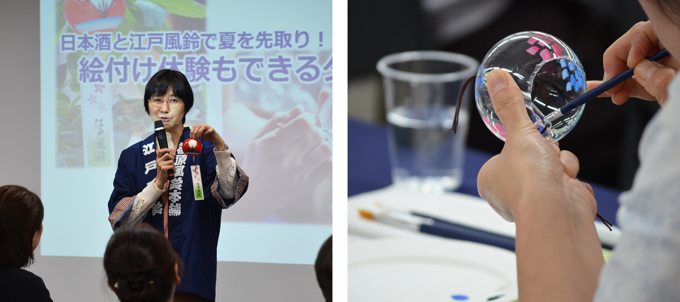江戸情緒を今に伝える江戸風鈴職人を招き、セミナーを開催。 江戸風鈴の歴史や作り方を学び、実際に絵付け体験をしていただきました。その後、江戸風鈴の音色の中、季節のお弁当と日本酒をお楽しみいただきました。