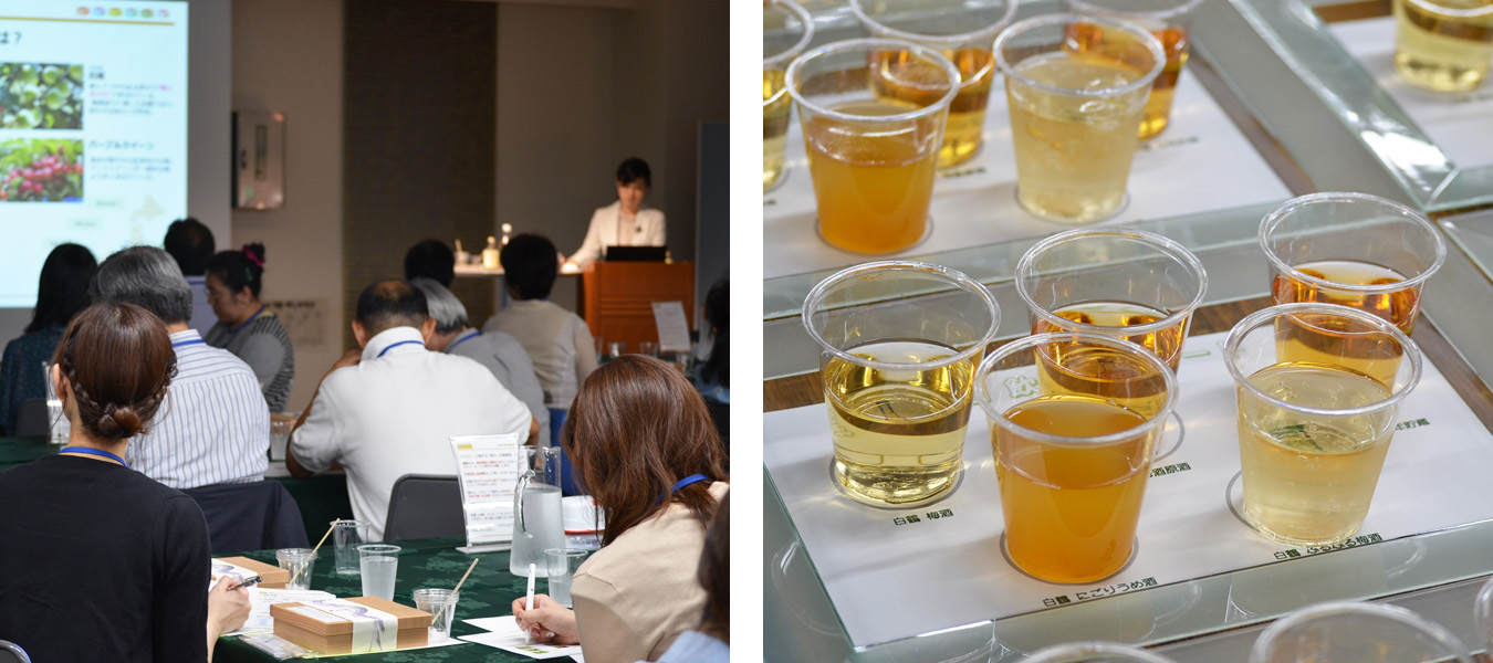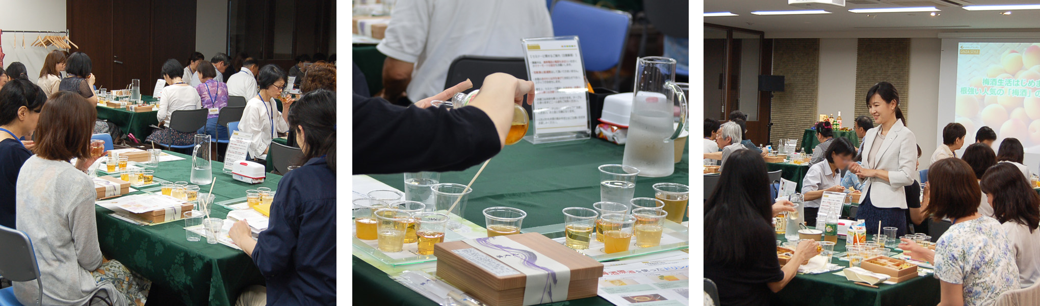 梅酒の効用や梅の品種の違いなど、梅酒に関する豆知識を学びながら、さまざまな種類の梅酒を実際に飲み比べていただきました。さらに梅酒を使ったカクテルやお料理レシピも紹介。蔵元仕込の本格梅酒と季節のお弁当を堪能いただきました。