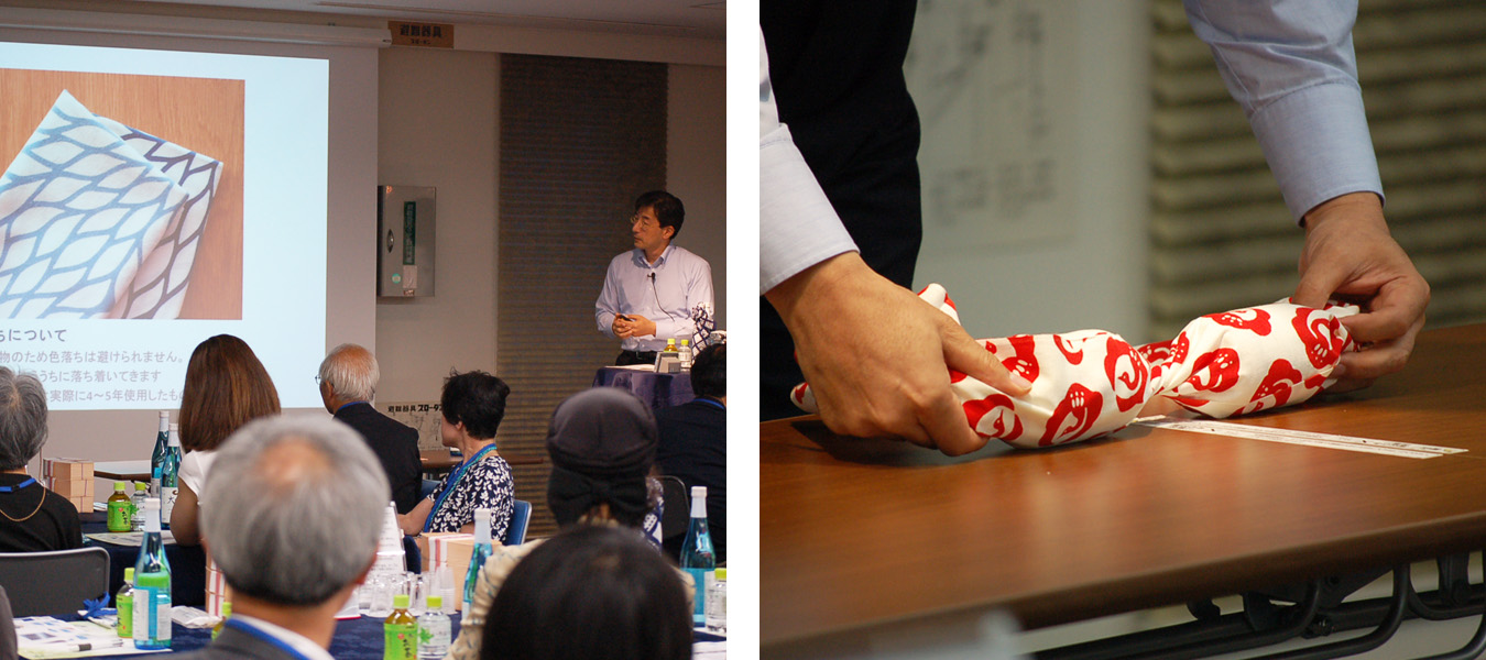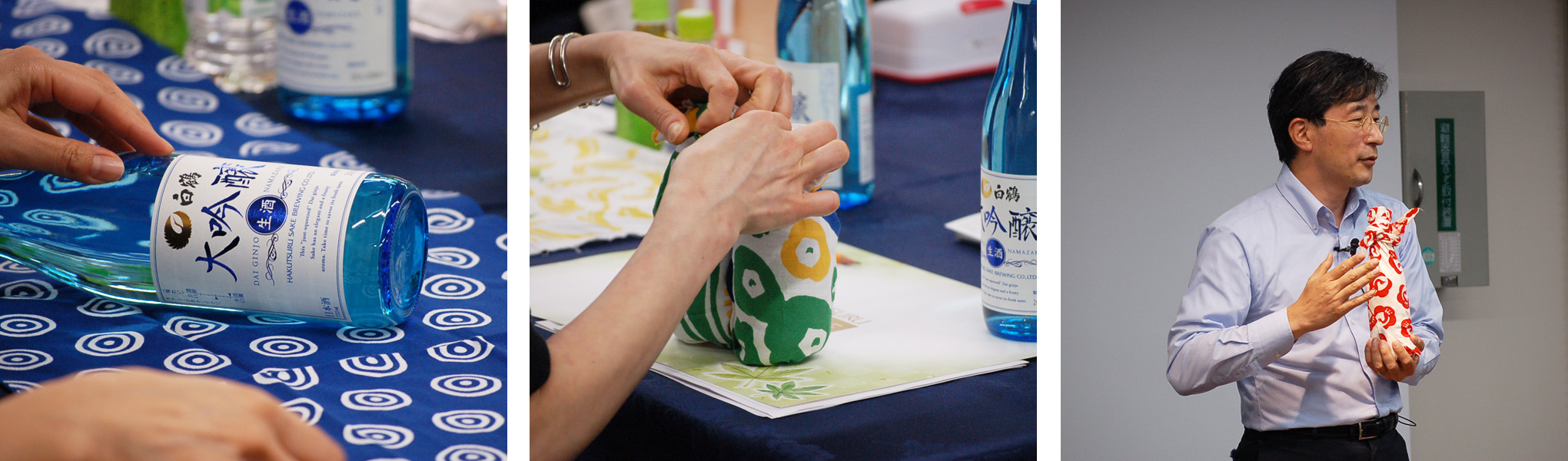 今日に"てぬぐい"の魅力を伝える、てぬぐい専門店「かまわぬ」から講師を招き、セミナーを開催。てぬぐいのおしゃれな使いこなし方を学びながら、実際に日本酒4合瓶のてぬぐい包みにも挑戦していただきました。レクチャー後は季節のお弁当と日本酒を堪能していただきました。