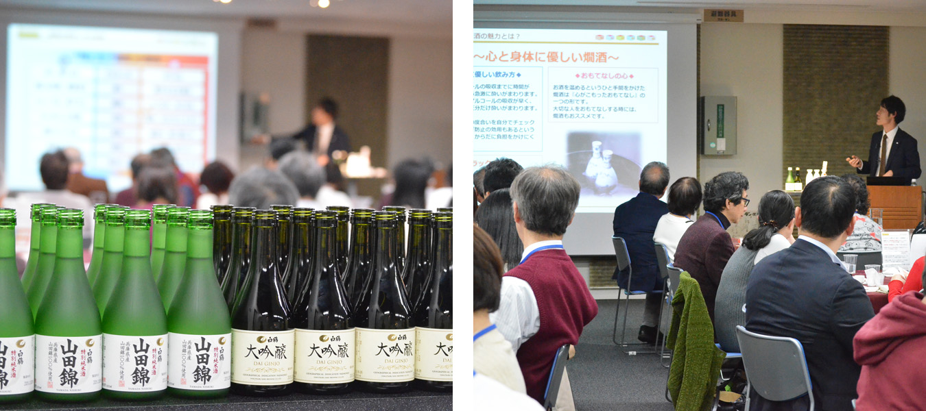 日本酒を湯煎で温め、ぬる燗や熱燗など、温度によって変わる味と香りを体験。その後、燗酒によく合うお弁当と共に、お好みの温度にお燗した日本酒をお楽しみいただきました。